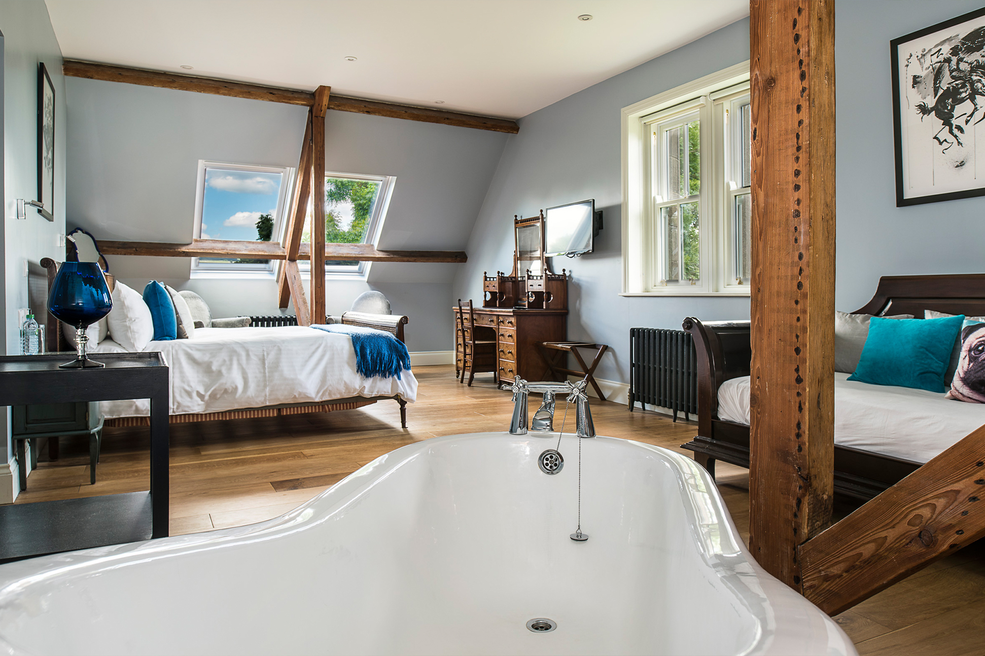 Floors, bannisters and sash windows have been restored, stairs carpeted in plush red, sofas covered in zinging velvet. Bathrooms are incredible, bedrooms are soothing and the papier-mâché hare’s head above the bar says it all. Stunning walks from the door take you along the River Ure to Aysgarth Falls, along the moors and up to the top of Penhill spotting much birdlife.